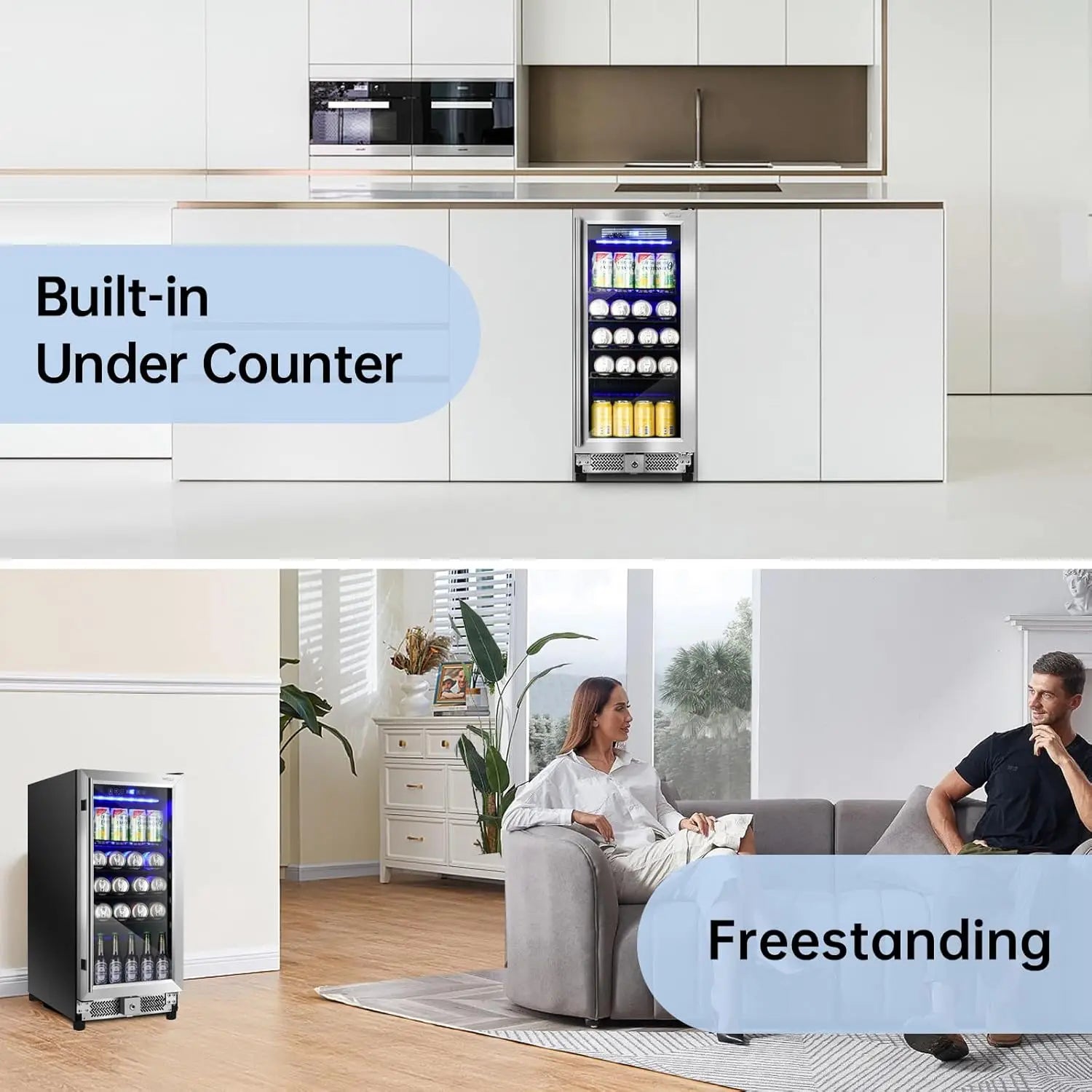15 Inch Refrigerator with Lock and Glass Door 78 Cans Under Counter Drink Cooler Fridge for Beer and Soda