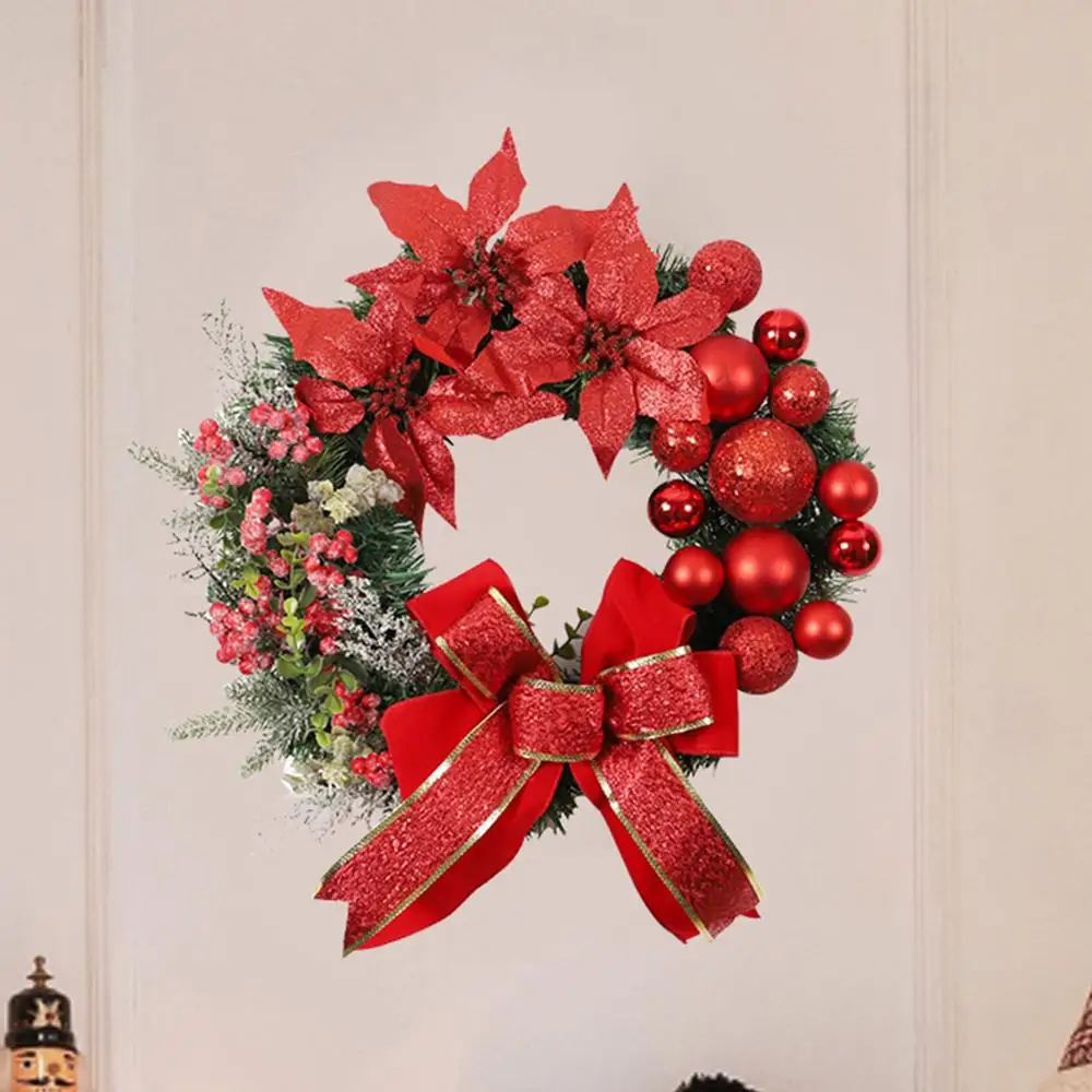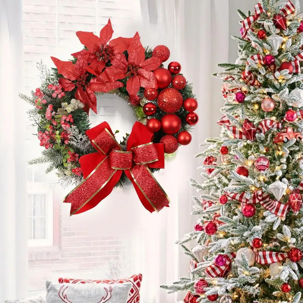 45CM Christmas Front Door Wreath Artificial Pine Needle Winter Wreaths Poinsettia Flowers Holiday Wreath with Ball Ornaments