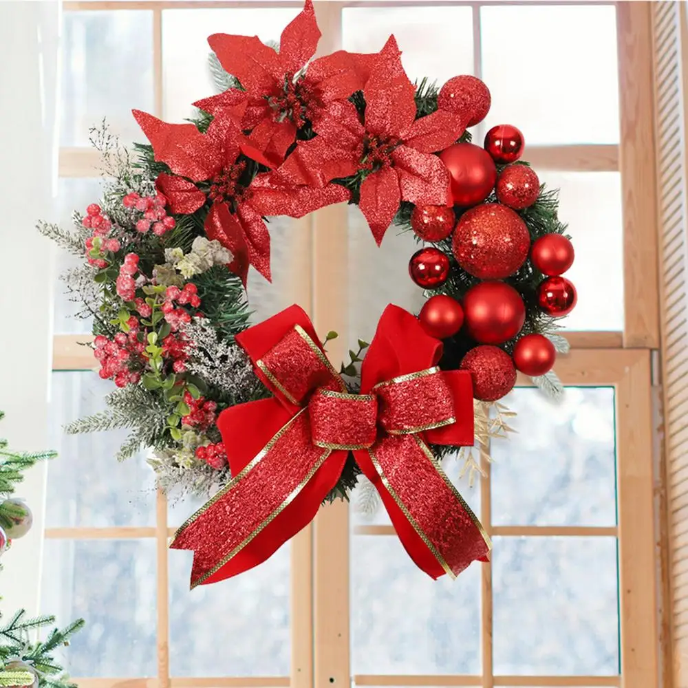 1.Christmas Themed Design: Decorating with red berries, red Christmas balls, poinsettia flowers, and a red ribbon bow, this wreath is bright in color and rich in winter season elements, creating a perfect addition for home that enhances the seasonal atmosphere