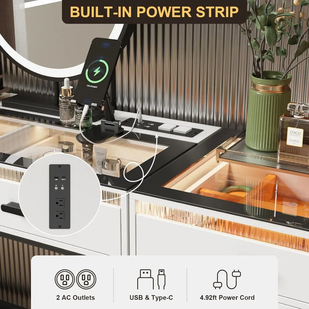 49 Inch Modern Vanity with Mirror and Light Charging Station 6 Drawers and Separate Drawers Bedroom Glass Vanity