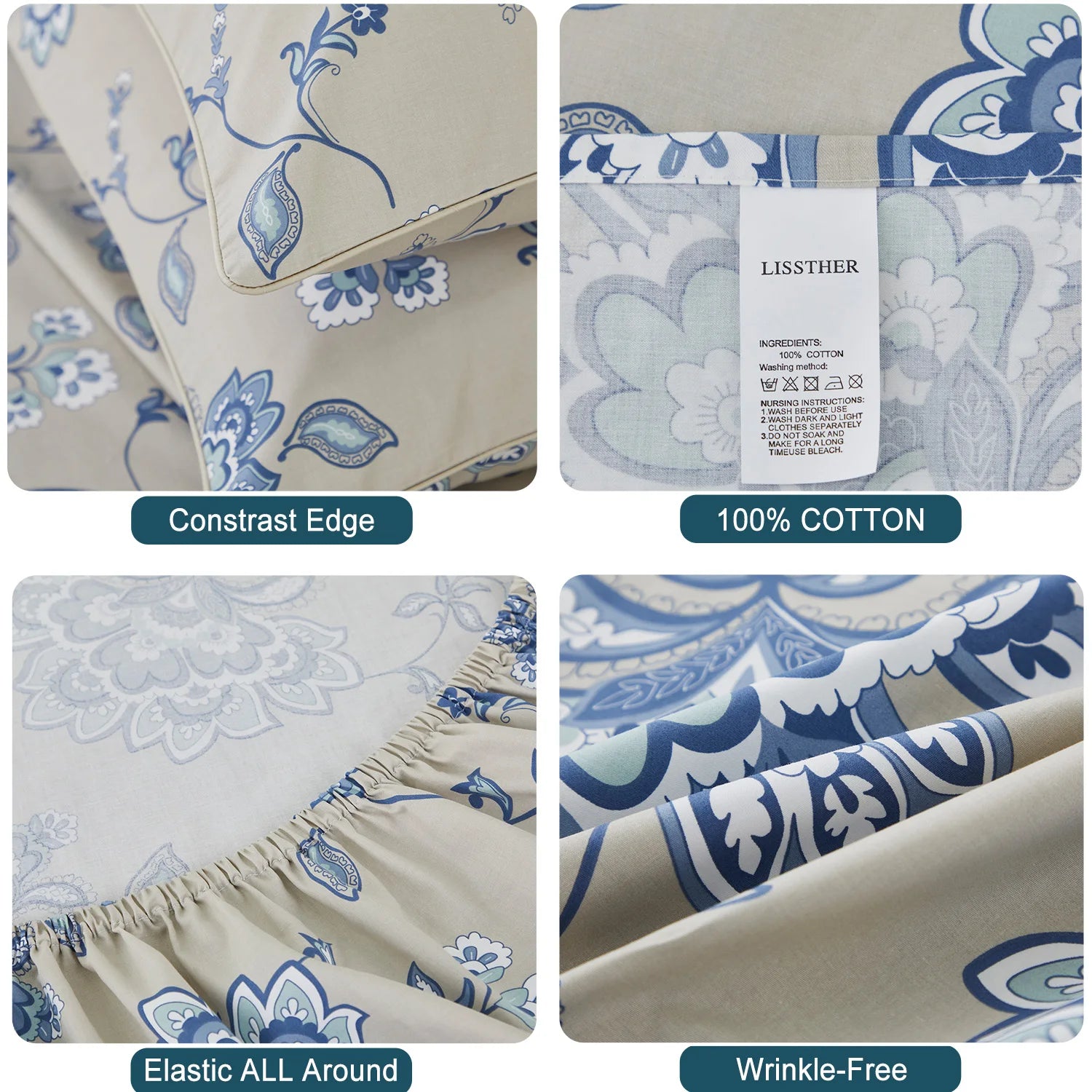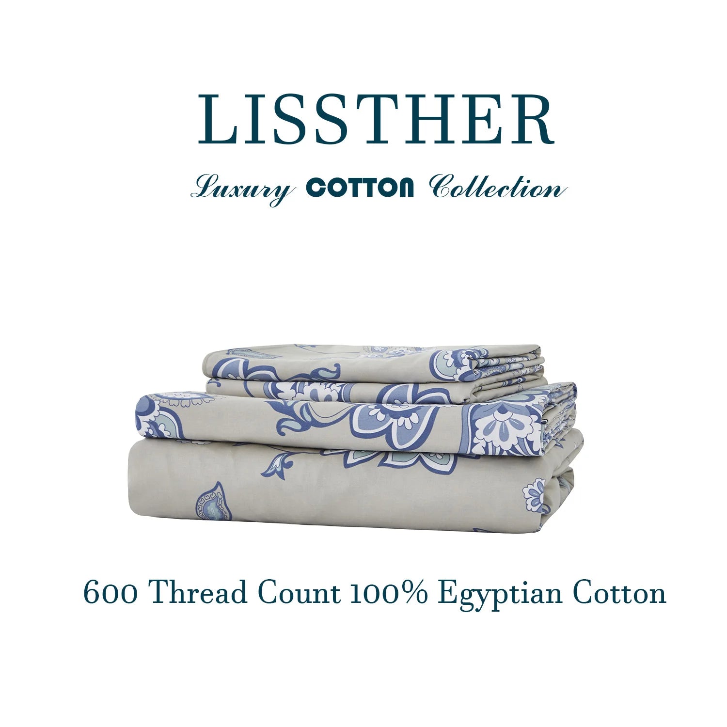4 Pieces 600TC 100 Percent Egyptian Cotton Sheet Set Blue Boho Damask Paisley Floral Soft Skin Friendly
