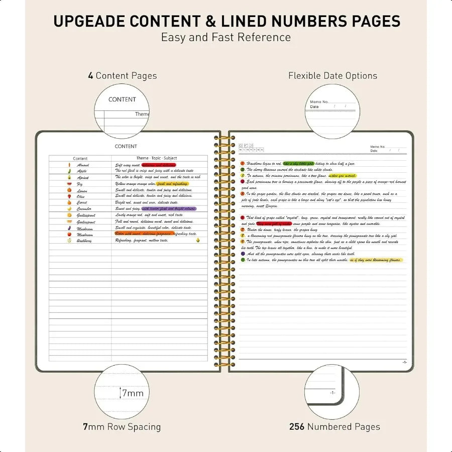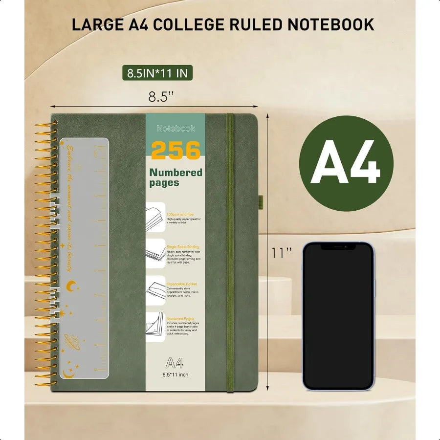 A4 Spiral Notebook Journal 8.5 x 11 256 Numbered Pages Hardcover Leather Journals for Women Men Large Lined College Ruled Noteb