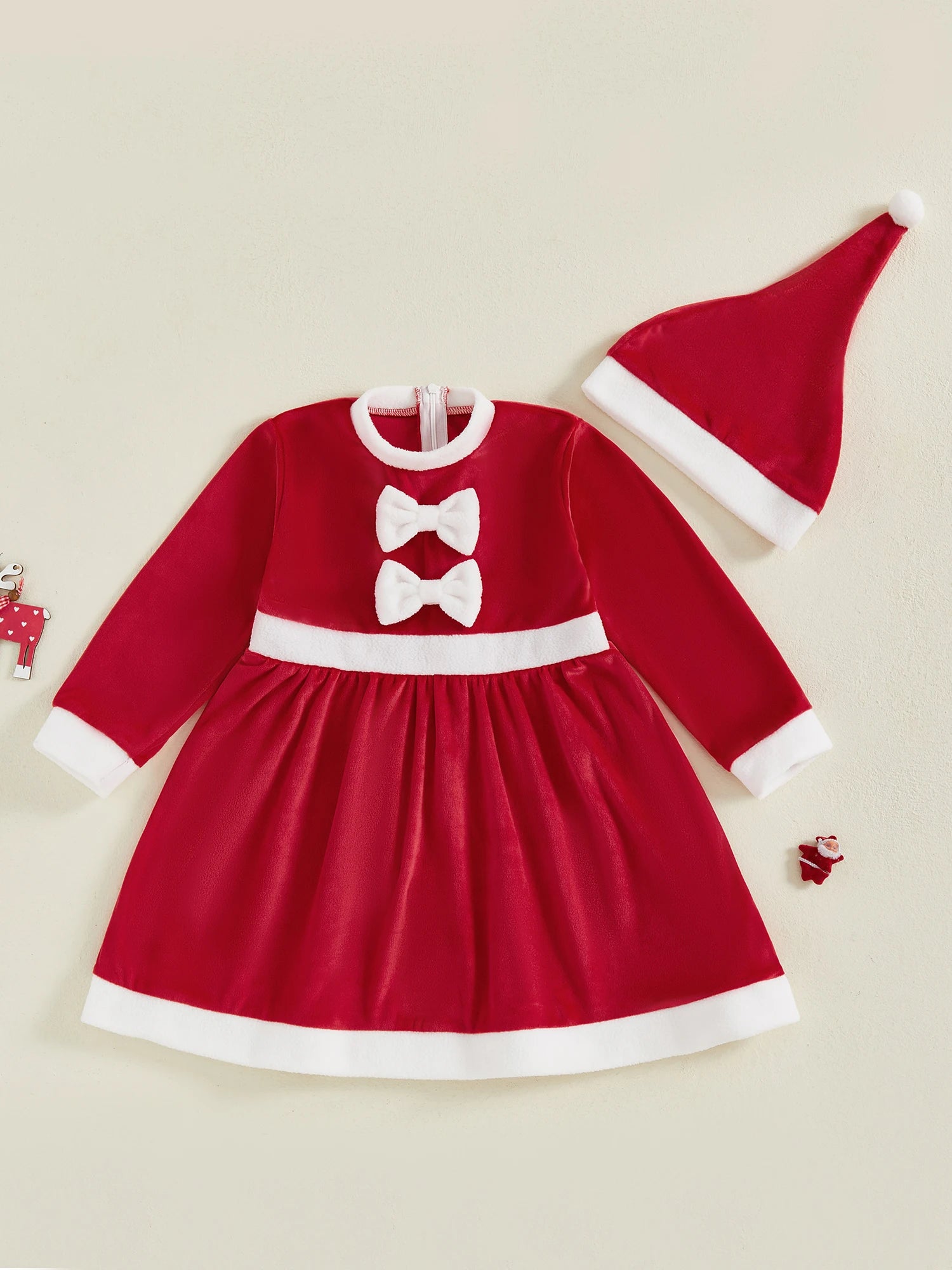 Toddler Girls Christmas Dress Fashionable Contrast Color Long Sleeve Bow Dress with Red HatSize(cm)