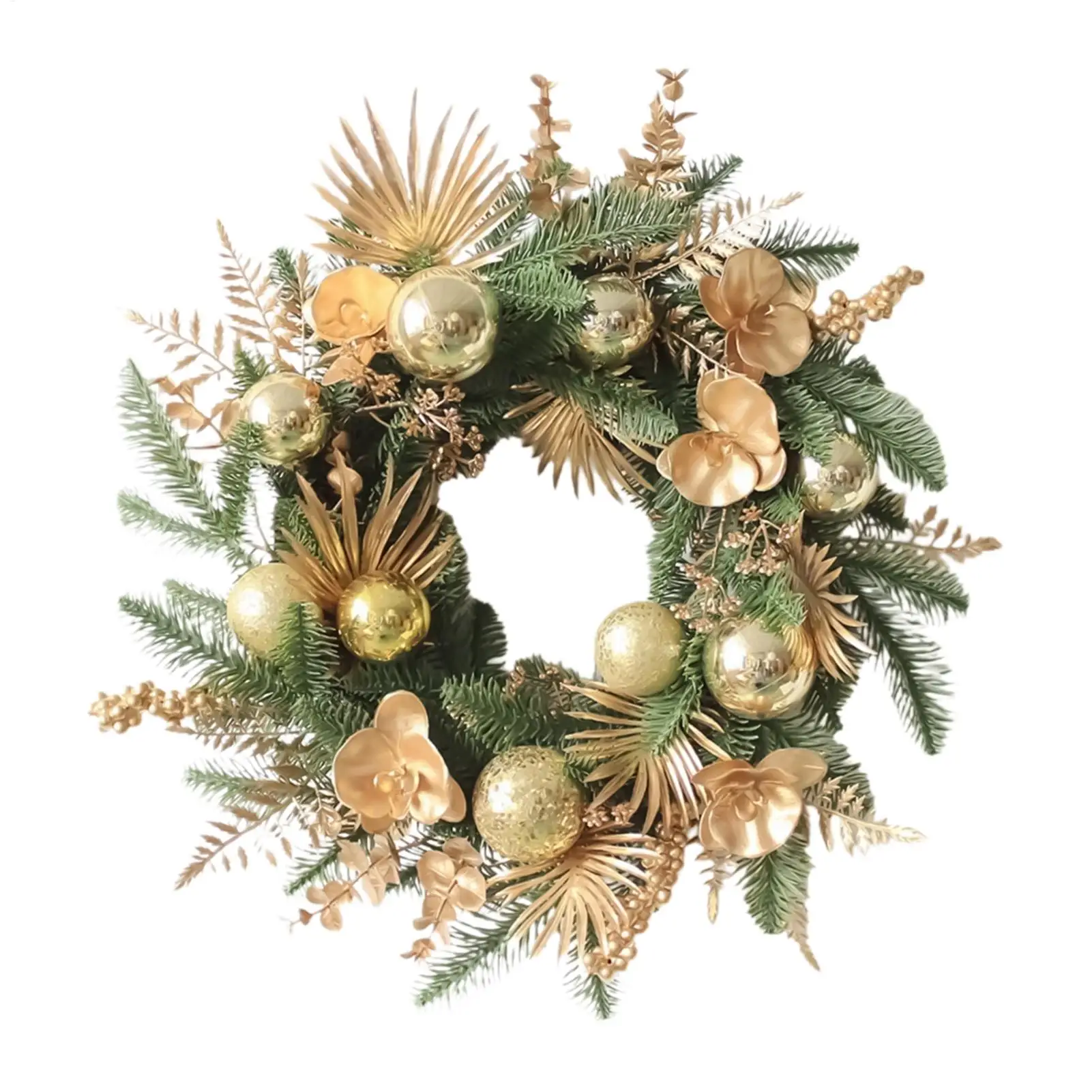 The Pine Holiday Wreath with Golden Ball is an artificial decor piece designed to improve your home and event spaces during the winter season. This decorative wreath serves as both a festive accent and a versatile addition to your indoor and outdoor settings. Perfect for walls, window, mantels, or doors, it seamlessly blends with various decor styles. Use it to bring charm to your living room, bedroom, workplace, garden, yard, patio, or porch. Ideal for holiday parties and seasonal celebrations, this wreath adds elegance and warmth without requiring maintenance. Crafted for durability, it suits diverse environments while maintaining its vibrant appearance. The golden ball accents provide a touch of sophistication, making it a standout piece for any occasion. Upgrade your space with the timeless appeal of this Pine Holiday Wreath.