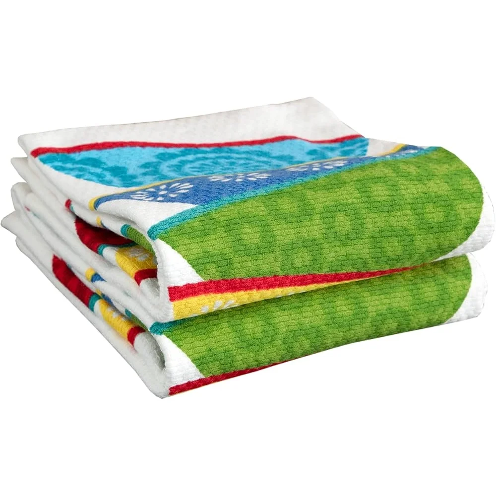 Double Sided Print Woven Cotton Kitchen Dish Towel Set 2-pack Lint-Free Absorbent Soft Machine Washable 16x26 Inch