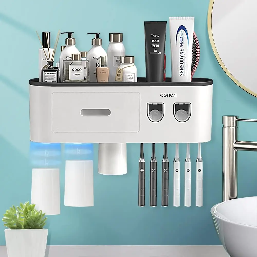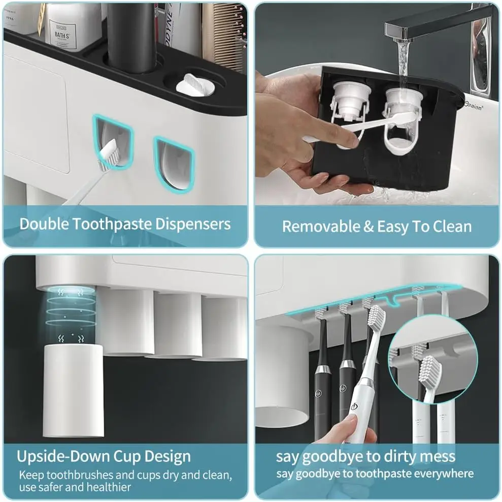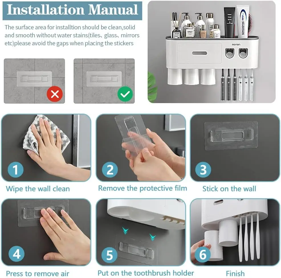 MULTI-FUNCTIONAL COMBINATION: A set of products containing 2 automatic toothpaste dispenser for family use, 3 Magnetic brushing cups, 6 toothbrush slots, multi- functional incorporating shelves, a set of products to solve the problem of incorporating toiletries of a family.