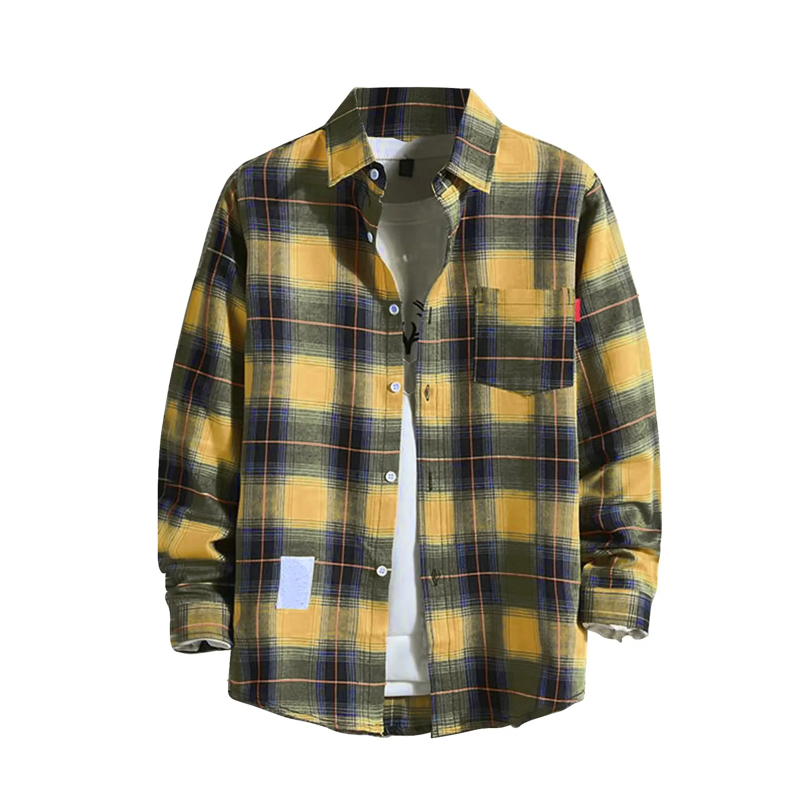 Harajuku Style Yellow Plaid Shirt For Men And Women Casual Loose Fit Long Sleeve British Fashion Trendy Couple Clothing