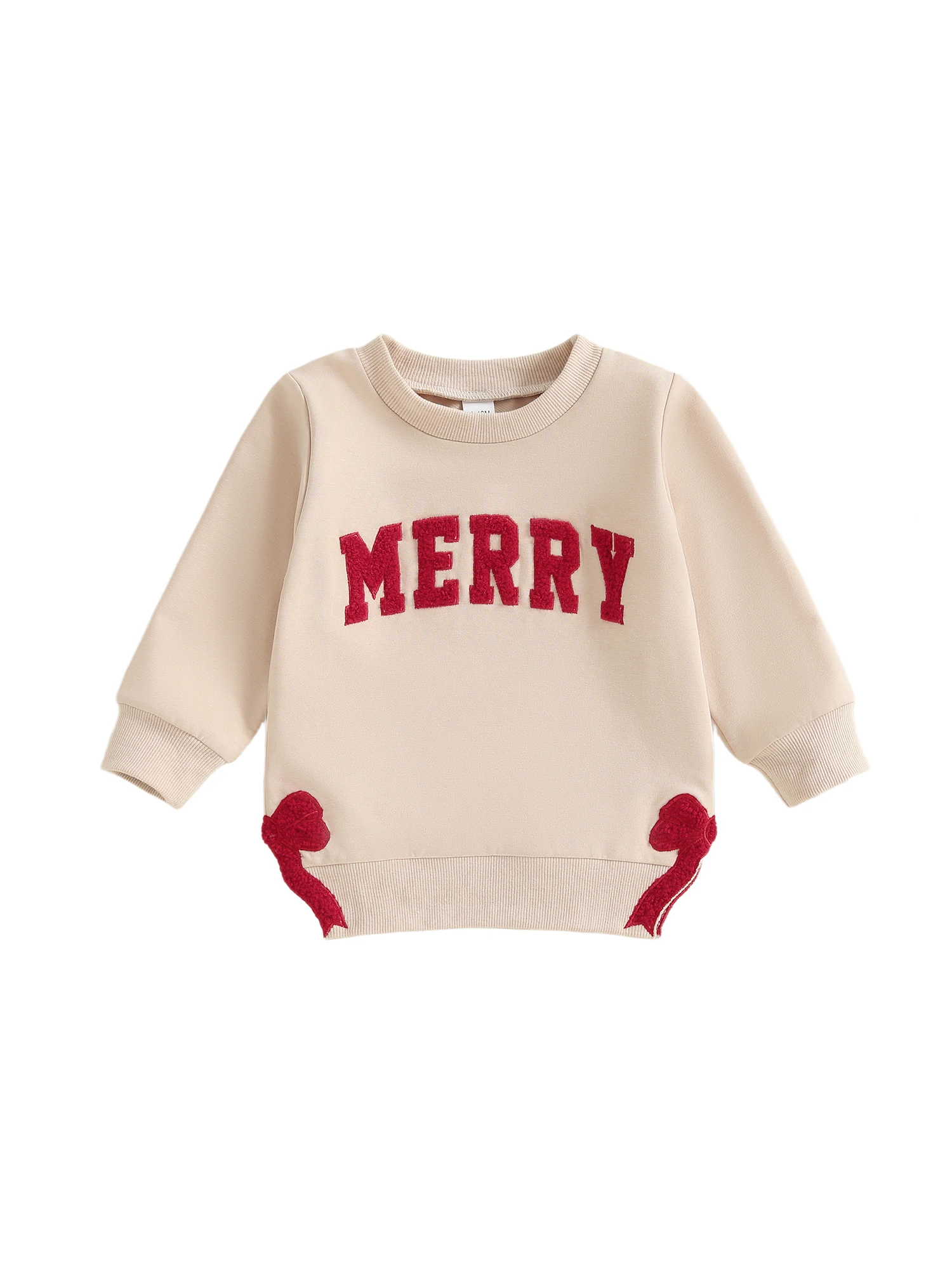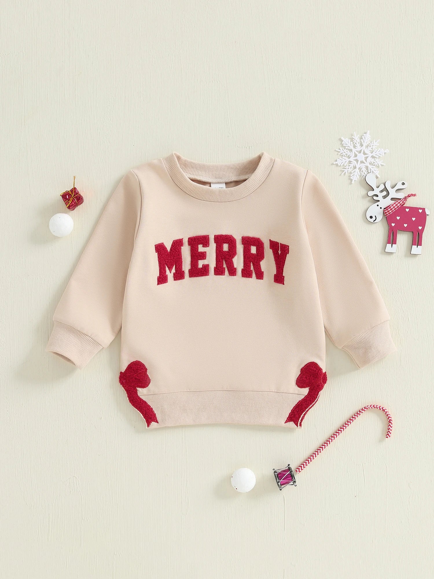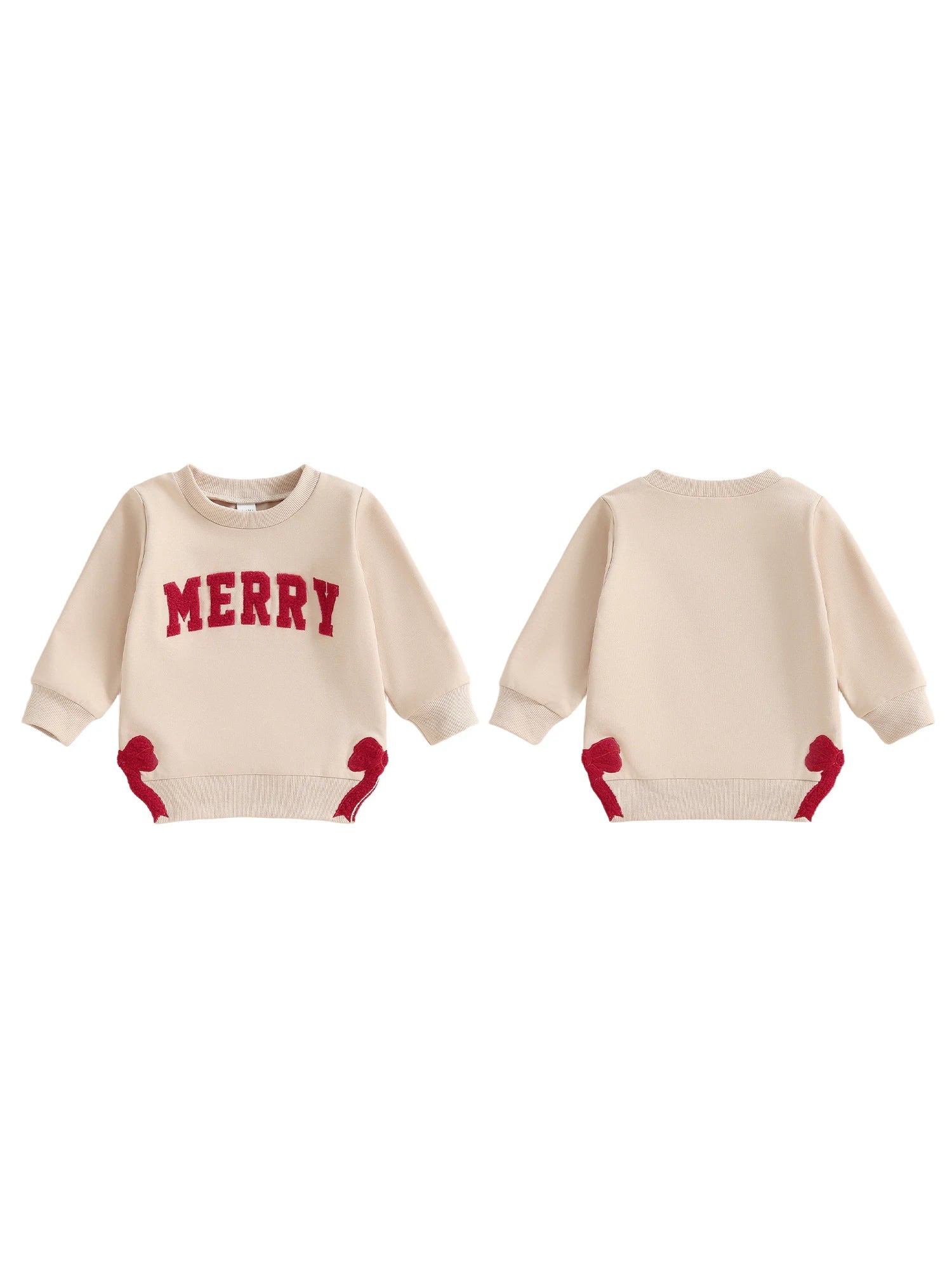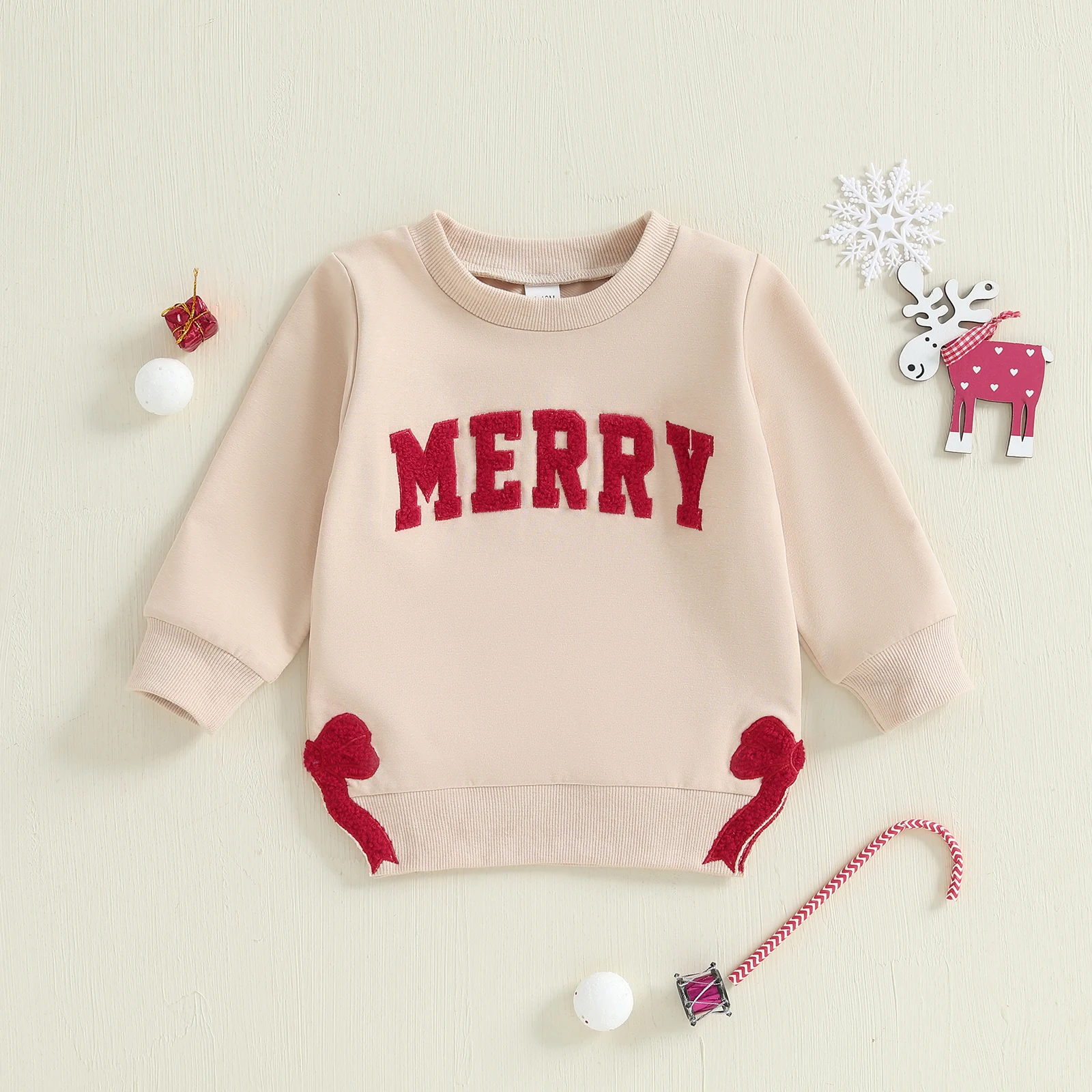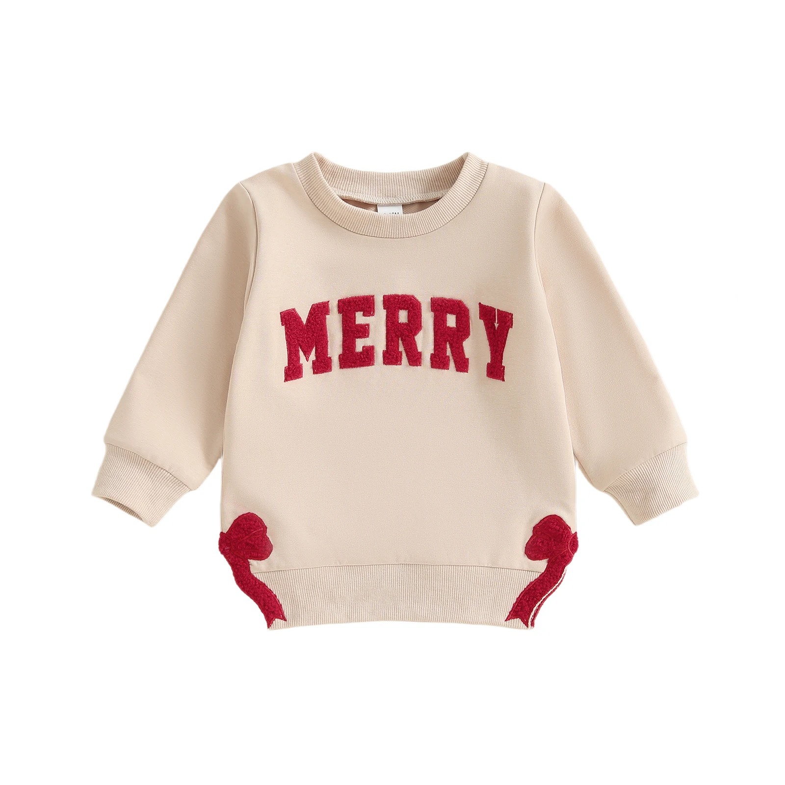 Toddler Baby Girl Christmas Sweatshirt Bow Letter Embroidered Side Split Hem Crewneck Long Sleeve Pullover TopsSize (cm)