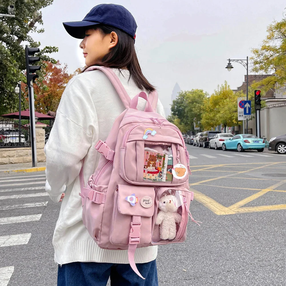 ![]() Student Schoolbag Fashion College Student Rucksack Nylon with Plush Pendant Pin Cute Kawaii Large Capacity for Teen Girls