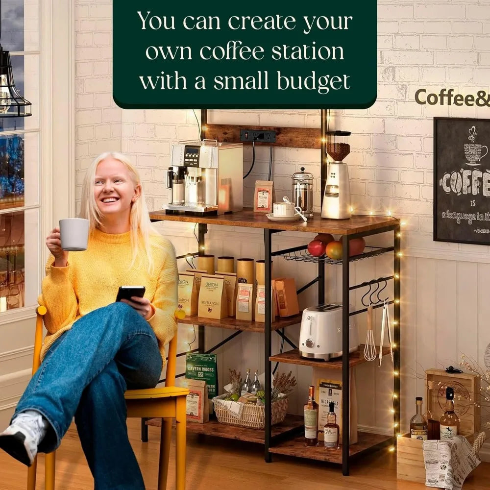 Kitchen Bakers Rack with Power Outlet & Hangers - 35.5x15.7x51.6 Kitchen Storage Rack Useful as Microwave Stand, Coffee Station