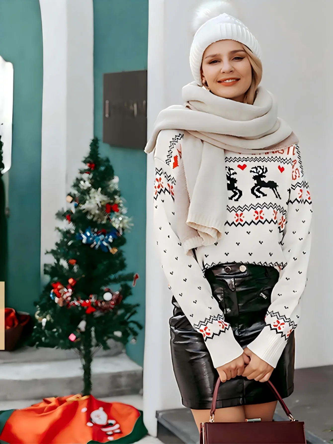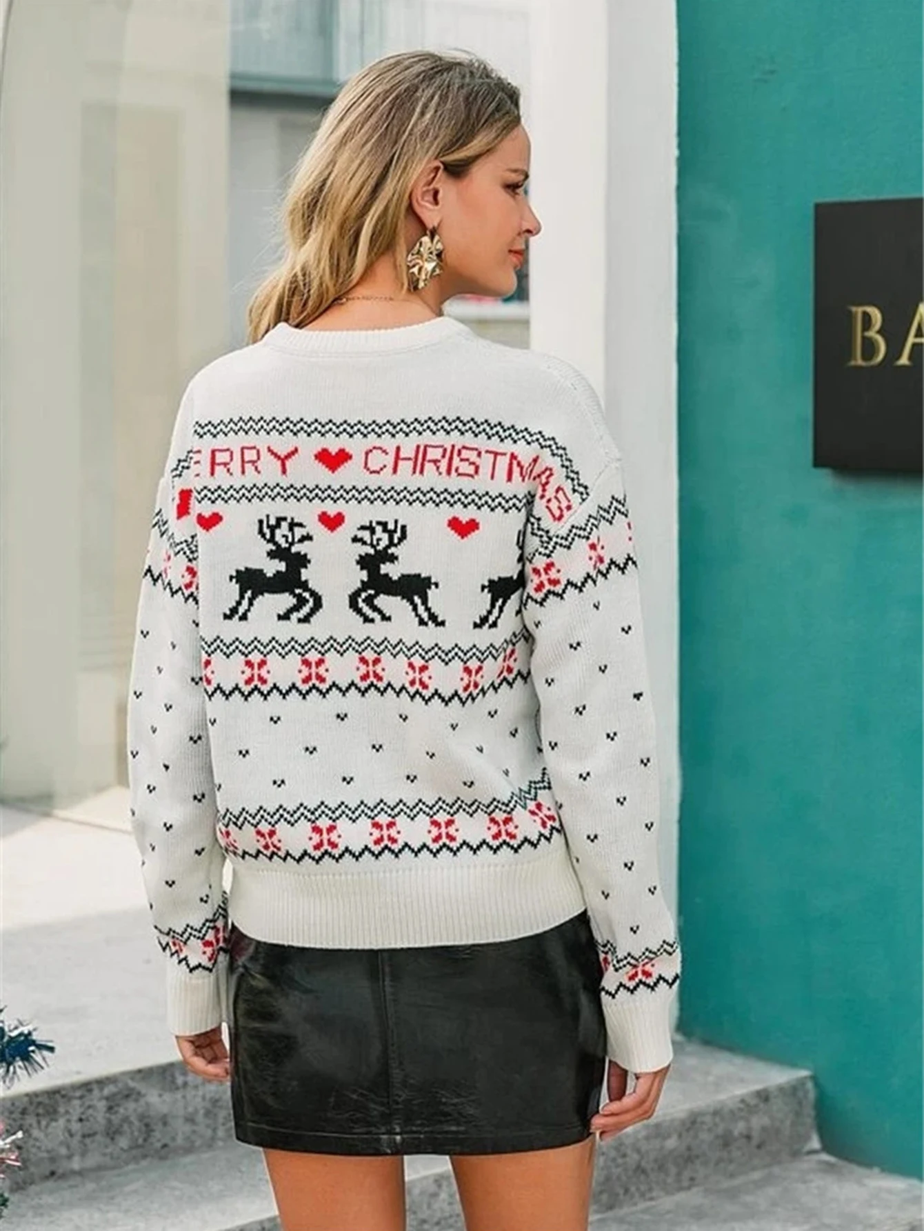 Loose sweater long sleeves round neck sweetheart neckline design, Christmas theme cute animal pattern ribbed neck pullover