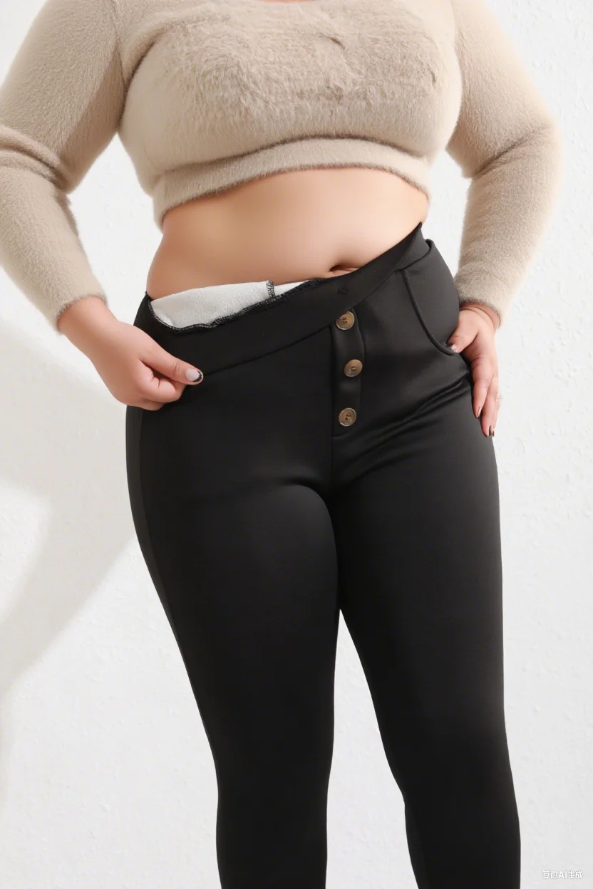 Plus-size high-waisted buttoned leggings for women, stretchy, slimming, fleece-lined, warm, base layer pants, suitable for outer