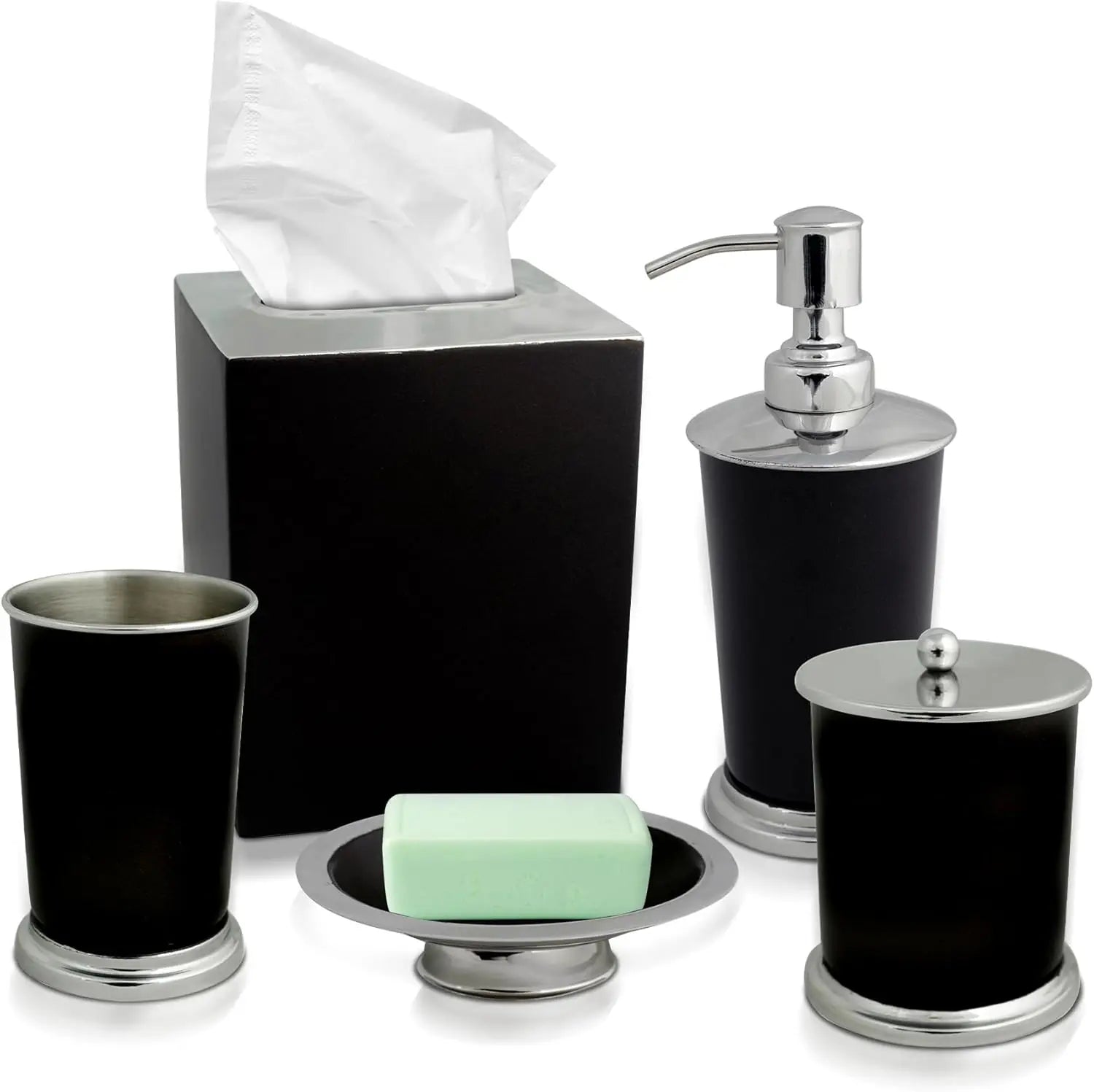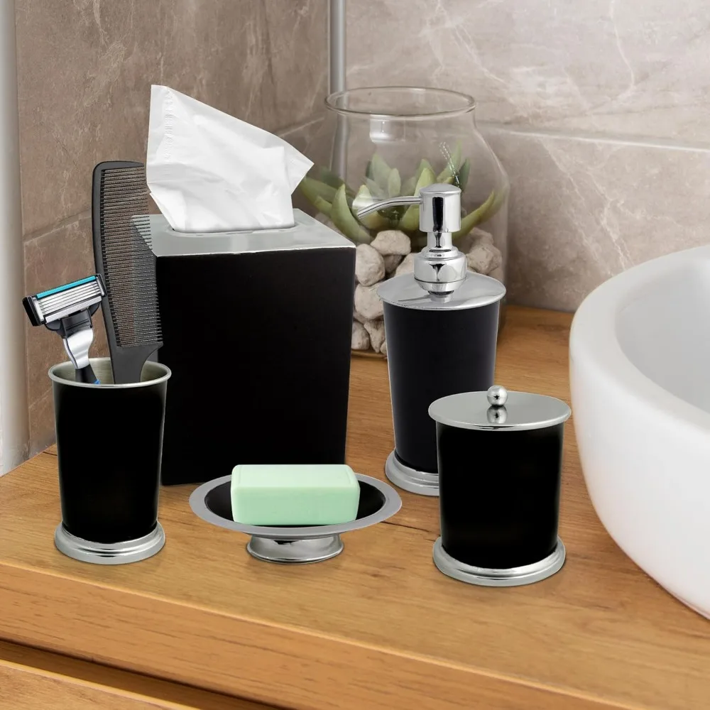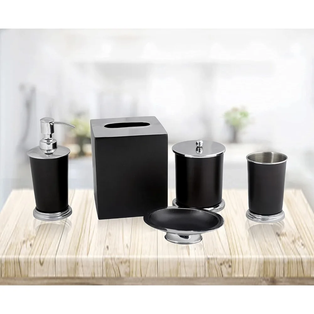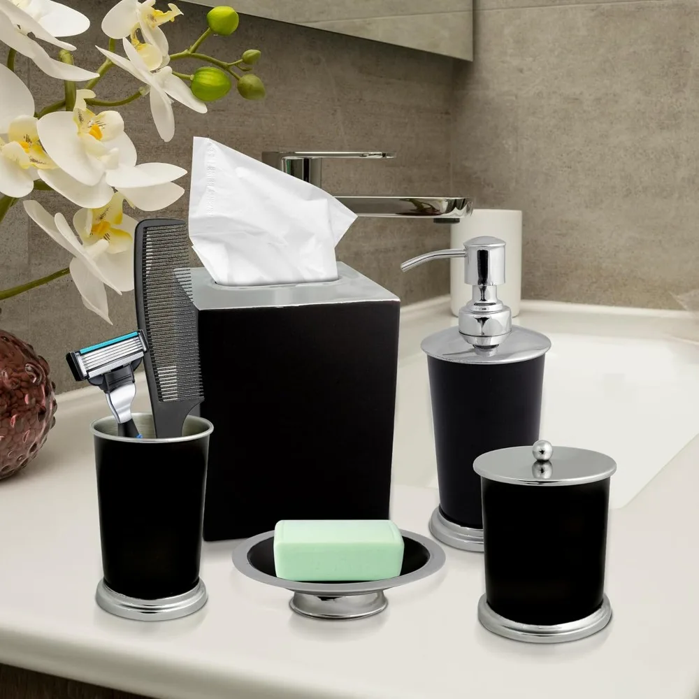 - Elevate bathroom decor with our 5-piece Elegant Bathroom Accessory Set. Includes Soap dispenser, Tumbler, Soapdish, Cotton Jar, Tissue Box for complete bathroom organization. Perfect bathroom accessories set for stylish home decor.