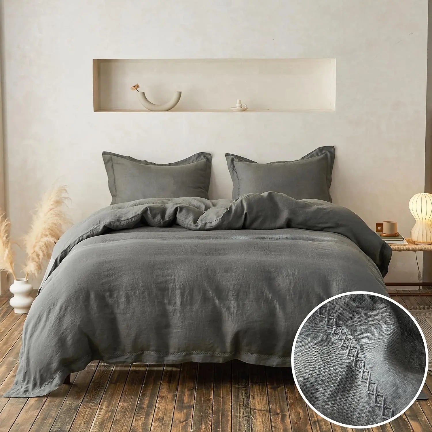 Simple Opulence 100 Percent Linen 3 Pieces Bedding Set with Crossed Embroidery Queen King Size Duvet Cover Bed Sheet Set Fitted Sheets