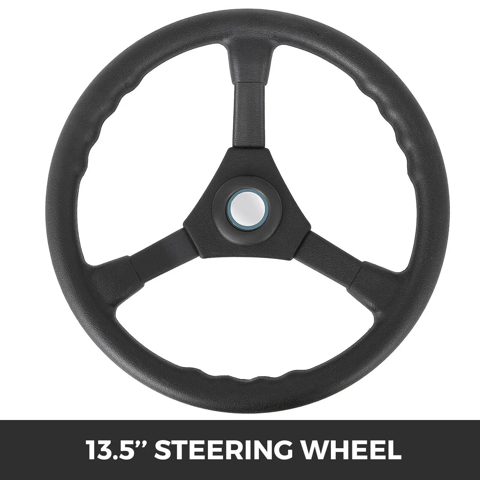The SucceBuy boat steering system kit is specially designed and developed for marine use. It comes with a 12 - ft steering cable, a standard 3/4" tapered shaft, a swivel helmet, a 13.5" steering wheel, a 90 - degree bezel kit, and hardware. It enables the vessel to steer accurately and improves work efficiency. Take control of your boat and create waves all summer long.