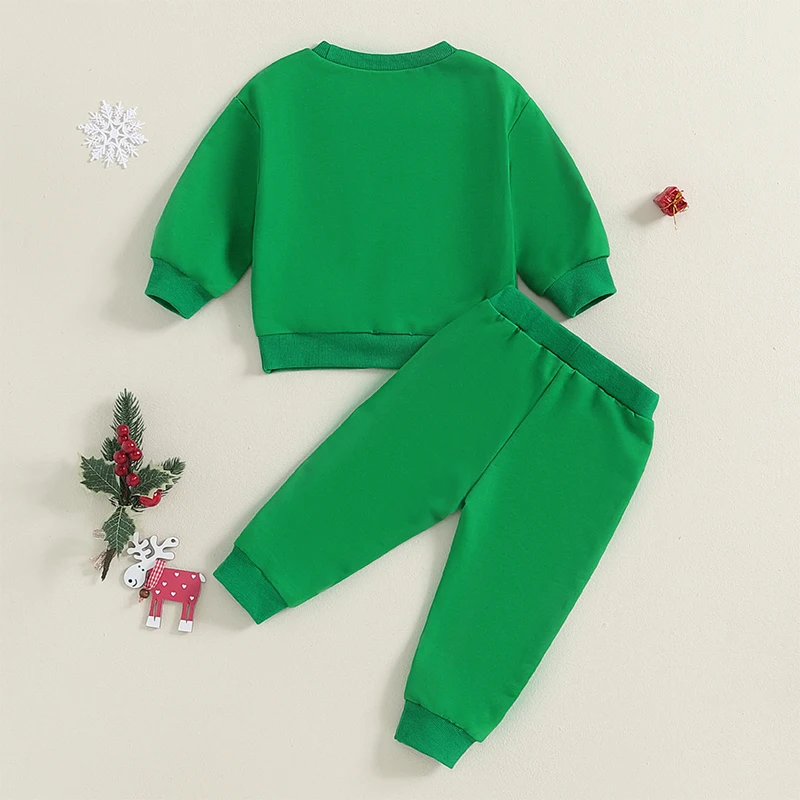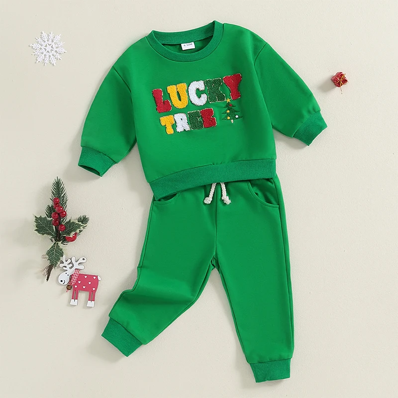 Toddler Boy Girl Winter Christmas Tree Print Long Sleeve Round Neck Sweatshirt and Pants Outfit Set with Letter Embroidery
