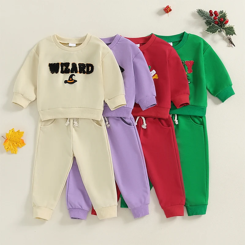 Little Girl Boy Fall Sets Christmas Tree Letter Embroidery Long Sleeve Round Neck Sweatshirt Long Pants OutfitsSize (cm)