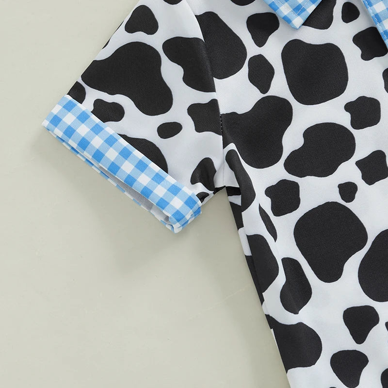 Little boy outfit with cow print and plaid patchwork; Baby boy t-shirt with front button closure and lapel collar, chest pocket, short sleeve design; Baby boy jeans with elastic waist design; Your little boy will be more eye-catching among his peers