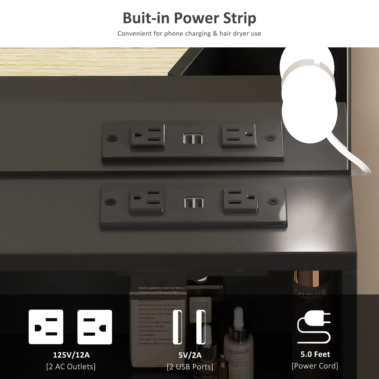 The centerpiece of this vanity set is the beautifully integrated lighted mirror that provides optimal lighting for flawless makeup application. Say goodbye to dimly lit rooms and hello to perfect illumination! With the added convenience of a power outlet, you can charge your devices while you get ready, keeping everything within arm's reach.