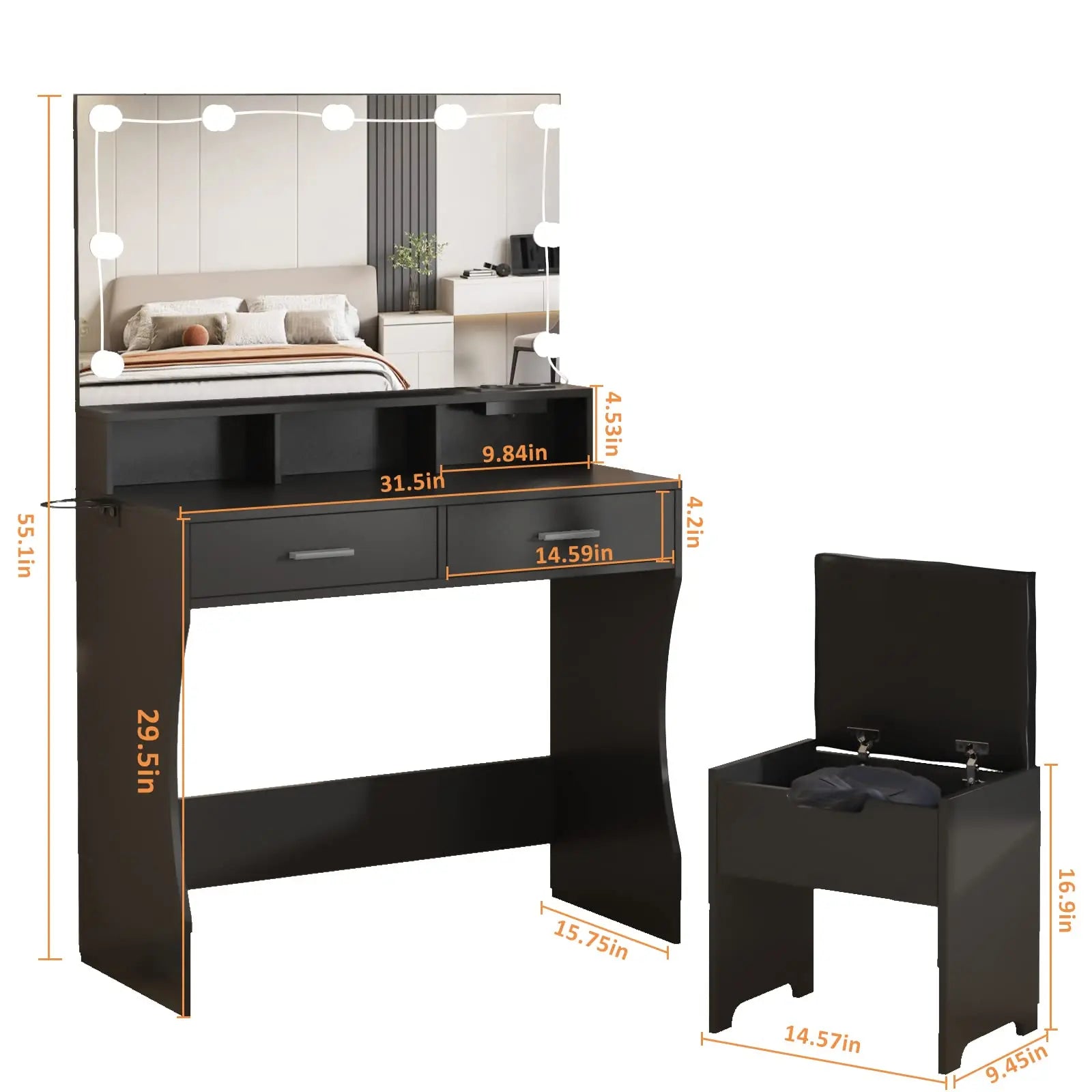 Introducing the Vabches Vanity Desk with Lights Mirror, your ultimate makeup vanity table designed for modern living. This exquisite wooden dressing table combines functionality and style, making it an essential addition to any bedroom. With a generous size of 31.5 x 15.75 x 55.16 inches, it offers ample space for all your beauty essentials while enhancing the aesthetic of your room.