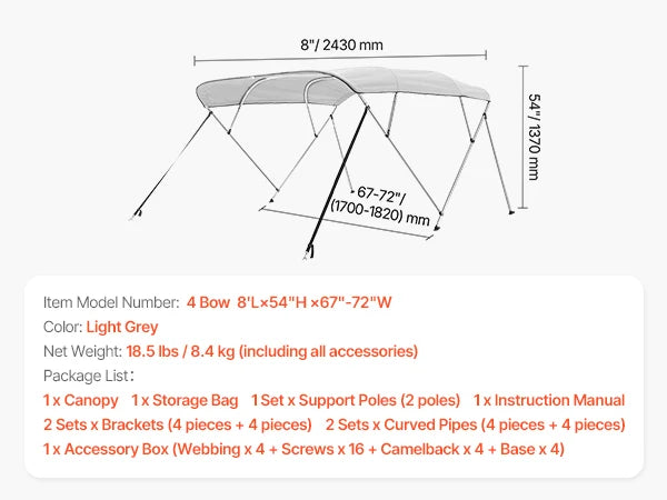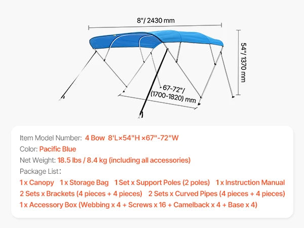 - Choose Your Ideal Size: Available in a variety of sizes, including 4 Bow 96"Lx(67"-72")W x 54"H. Simply measure your boat’s deck width and pick the awning that fits your boat.