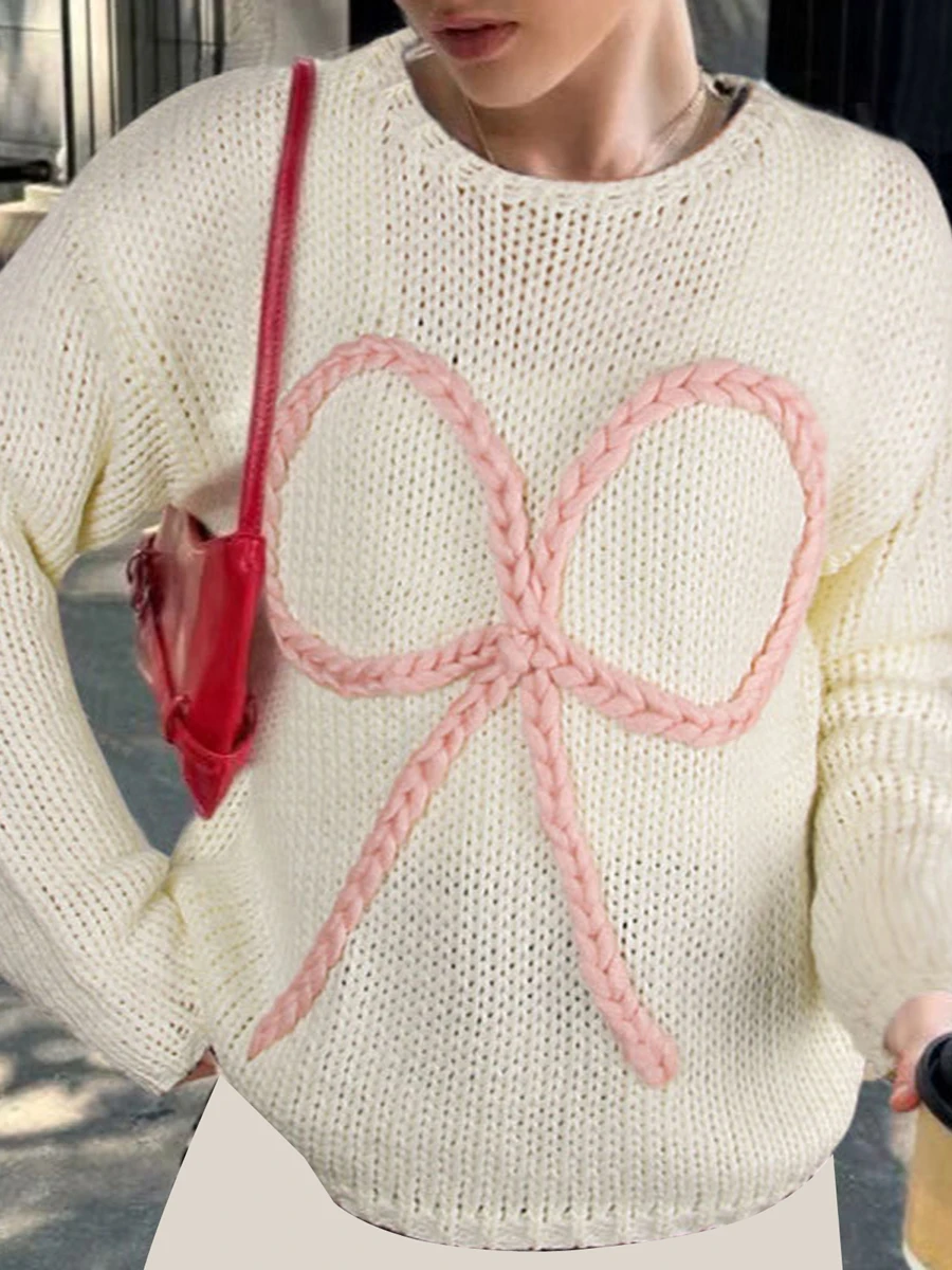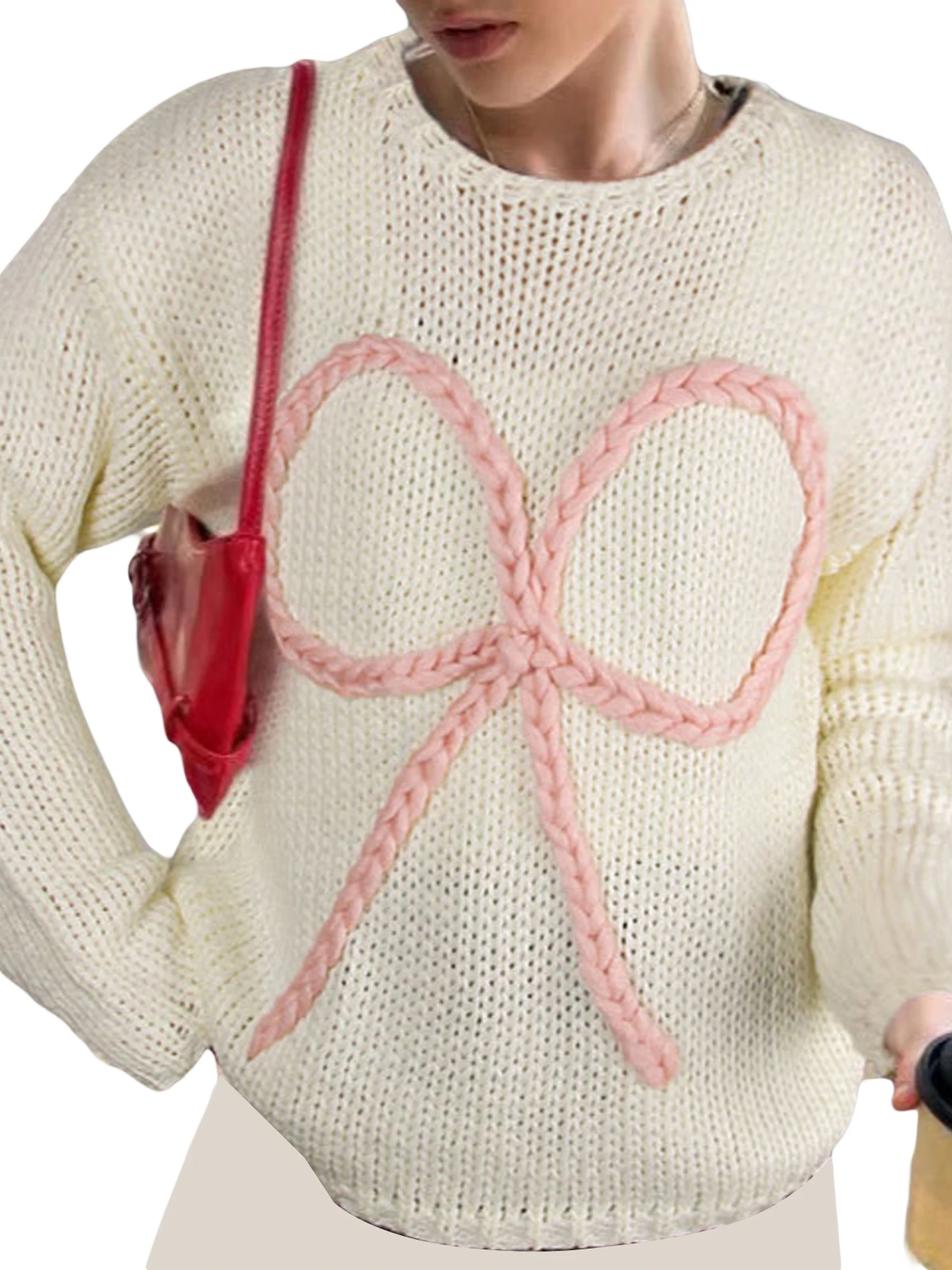 Women's Oversized Bow Embroidery Sweater Long Sleeve Round Neck Knit Pullover Autumn TopsFeatures: